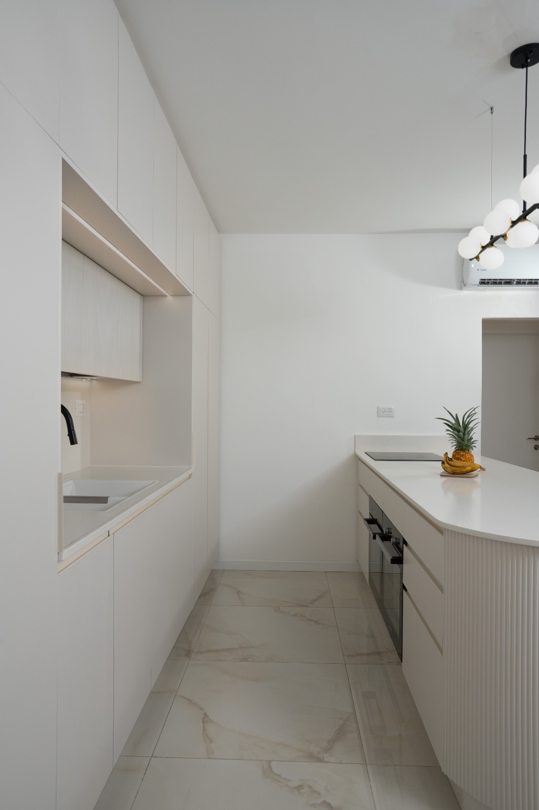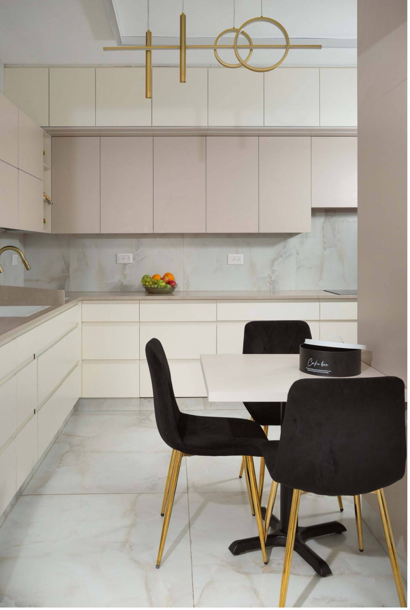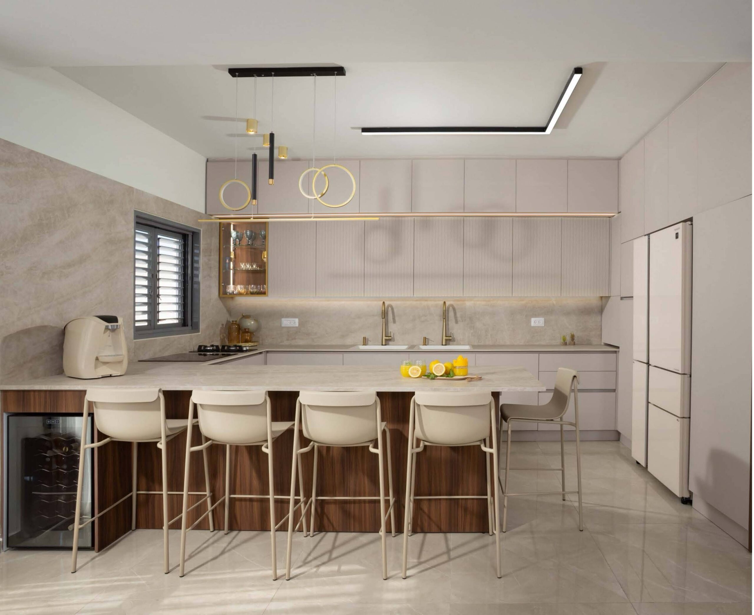 מטבח שמשדר חדשנות ואלגנטיות עכשווית. מתאפיין בקווים נקיים, עיצוב מינימליסטי ושימוש בחומרים מתקדמים. חללים פתוחים ומשטחים חלקים יוצרים מראה מרשים ומדויק.