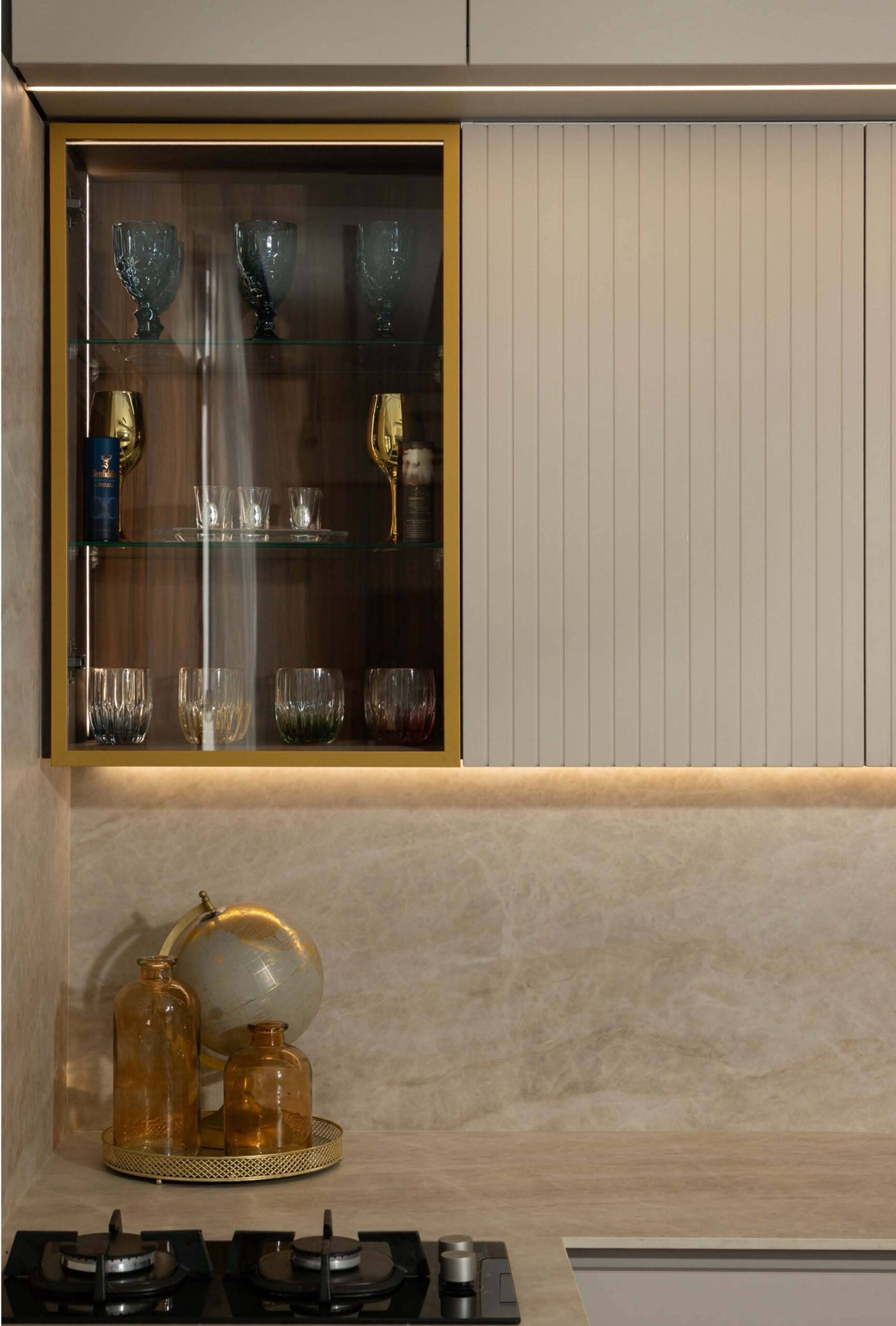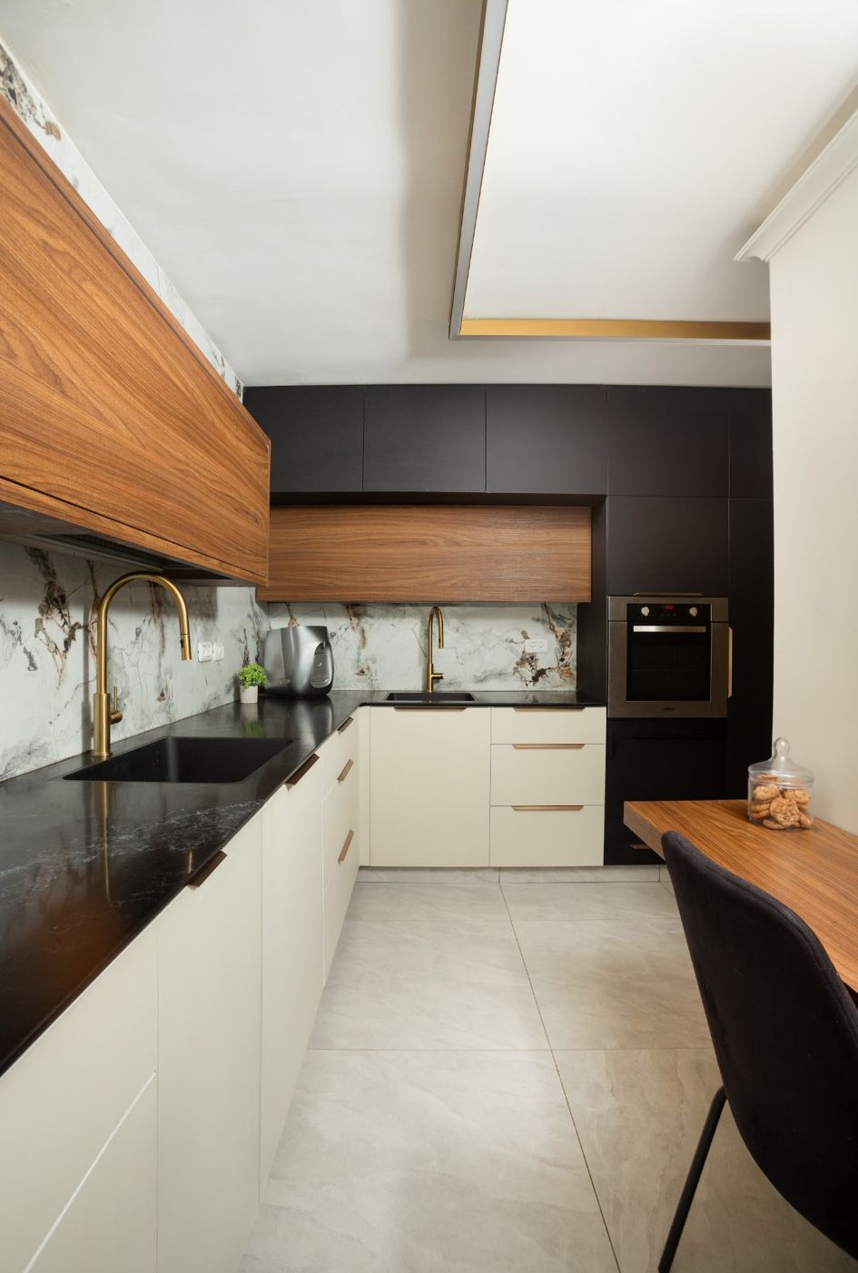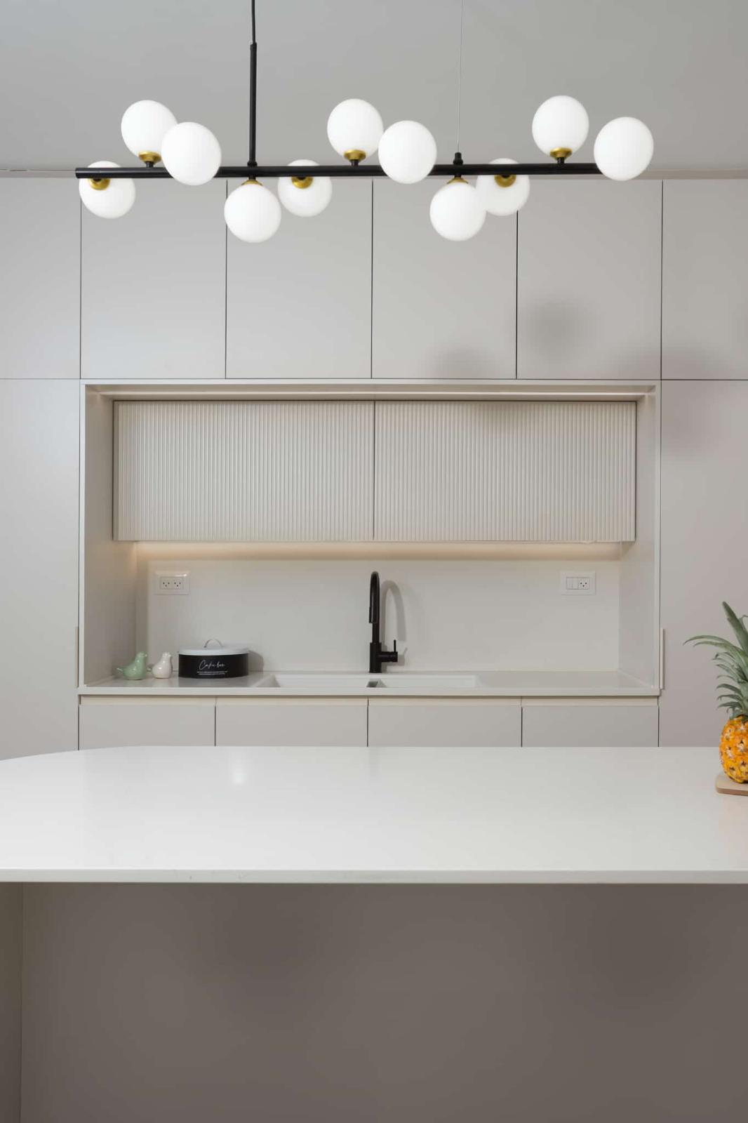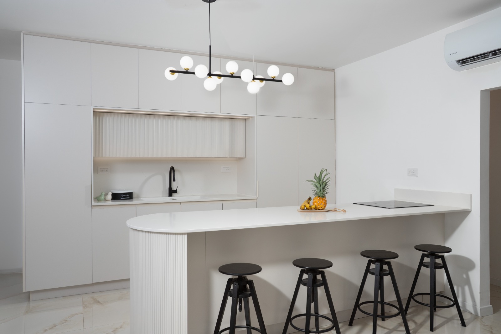 מטבח שמשדר חדשנות ואלגנטיות עכשווית. מתאפיין בקווים נקיים, עיצוב מינימליסטי ושימוש בחומרים מתקדמים. חללים פתוחים ומשטחים חלקים יוצרים מראה מרשים ומדויק.